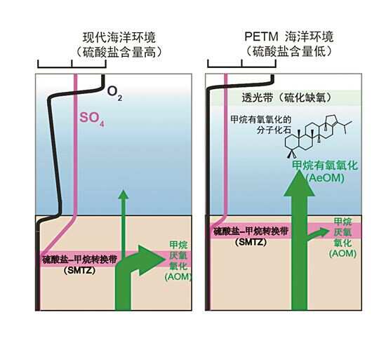 ■PETM时期北极海洋甲烷氧化路径转变概念图。(研究团队供图)
