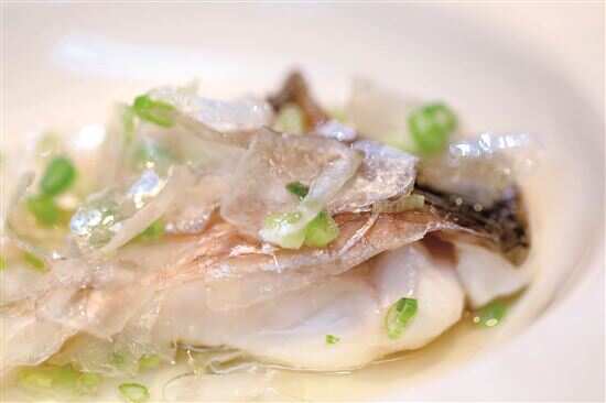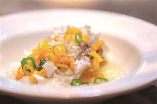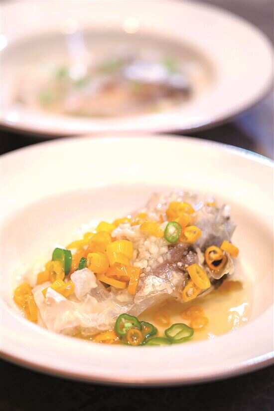 食材的选择上,他也坚持品质+特色的选材标准,从化流溪河有一种鱼俗称“娟鱼”,是流溪河水域独有的经济鱼类。这种鱼对水质的要求比较高,生长周期也较缓慢,所以肉质肥厚且味道鲜嫩,并且鱼鳞也可以直接食用,非常有特色。谢艺超将娟鱼做成一鱼两味,一味是简简单单的油盐蒸,一味则是加入贡椒蒸,微微辣的惹味口感更加激发出鱼肉的鲜,一浓一淡,各有特色,恰便是:浓妆淡抹总相宜。