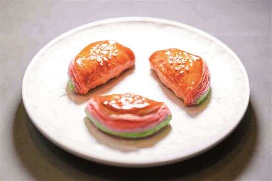 另一款酥类点心黑椒牛肉酥同样复刻自历史上羊城知名的星期美点,传统起酥工艺搭配三层色彩,好吃又好看。