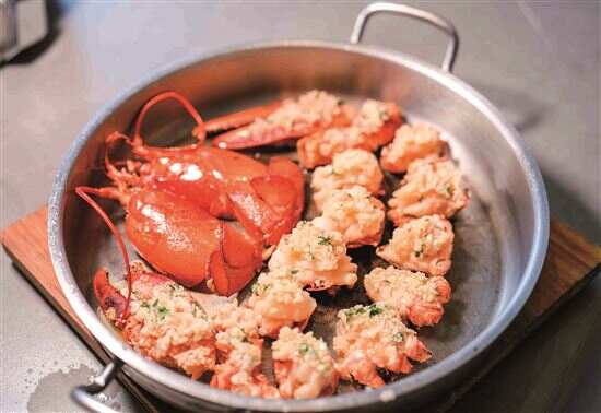 啫煲当然是主打之一,但与传统粤菜相比,新鲜花椒、黄贡椒等元素的融入,也让味蕾增添了更多不一样的体验。一款蒜茸啫蓝龙虾,蒜茸绝对堪称点睛之笔,每一块被斩开的带壳蓝龙虾肉上都堆着满布的蒜茸,蒜香扑鼻,最难下手的虾钳部分已被去了大部分硬壳,只保留了一小块可以手持的虾壳,直接拿起来大快朵颐,好不快哉!