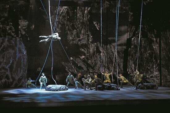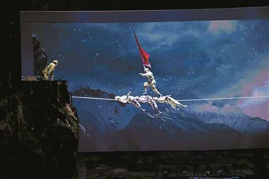 新快报记者在现场看到,在大雪纷飞的布景,悲壮低沉的背景音乐中,演员们“艰难”地在悬挂的长绳间飞跃,伴随着动画背景里的雪崩和落石,再现了当年修路环境的恶劣。在一段空中飞人的演出结束后,舞台上矗立的两座山之间,巧妙地架设出了一条钢丝,国家级非遗达瓦孜绝活正式亮相。
