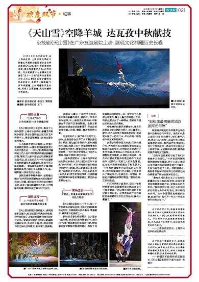 10月6日正值中秋佳节,由上海杂技团、上海市马戏学校与新疆艺术剧院杂技团联合出品的杂技剧《天山雪》在广东友谊剧院首演,演出现场掌声不息,反响热烈。作为荣获第十七届精神文明建设“五个一工程”优秀作品奖的力作,《天山雪》用具有沪疆特色的杂技语汇,展现了一幅跨越70多年的援疆、文化润疆的历史长卷,展现了上海援疆、文化润疆的丰硕成果。