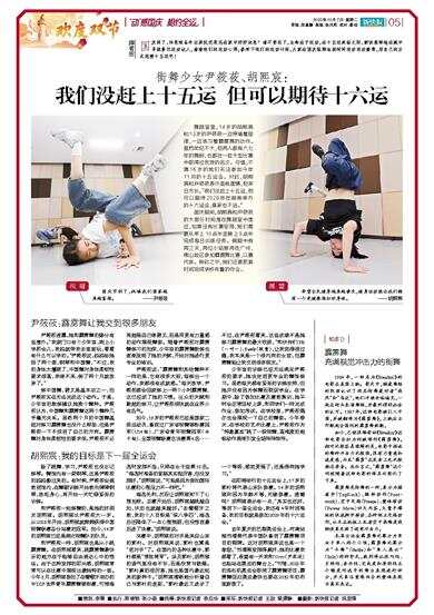 舞蹈室里,14岁的胡熙宸和13岁的尹筱莜一边哼唱着旋律,一边练习着霹雳舞的动作。虽然年纪不大,但两人都有六七年的舞龄,也都在一些大型比赛中取得过优异的名次。可惜,不满16岁的她们无法参加今年11月的十五运会。对此,胡熙宸和尹筱莜表示虽有遗憾,但来日方长。“我们没赶上十五运,但可以期待2029年在湖南举办的十六运会,离家也不远。”