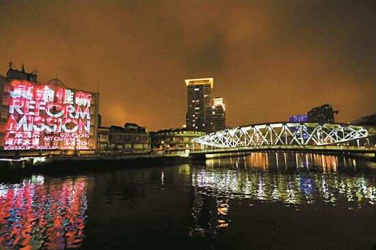 作为“其命惟新——广东美术百年大展”预热活动之一,苏州河畔的“闪亮·上海 静安光影季”在国庆中秋长假期间的每天18时至22时,上演了广东美术名家名作光影秀,吸引众多市民、游客驻足观看。
