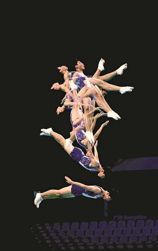 ■蹦床运动员比赛中(多重曝光)。