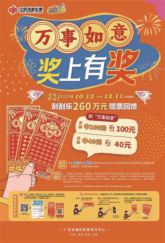 每一张福利彩票,寄托着对美好生活的期待,同时体现了对社会责任的担当。一张10元钱的刮刮乐即开票,其中2元转为福彩公益金,为社会福利和公益事业的发展贡献力量。2025年即开型福利彩票“万事如意”定向营销活动即将开启,期待彩民朋友在助力公益的同时收获幸运惊喜。广东福彩温馨提示,理性购彩,量力而行。