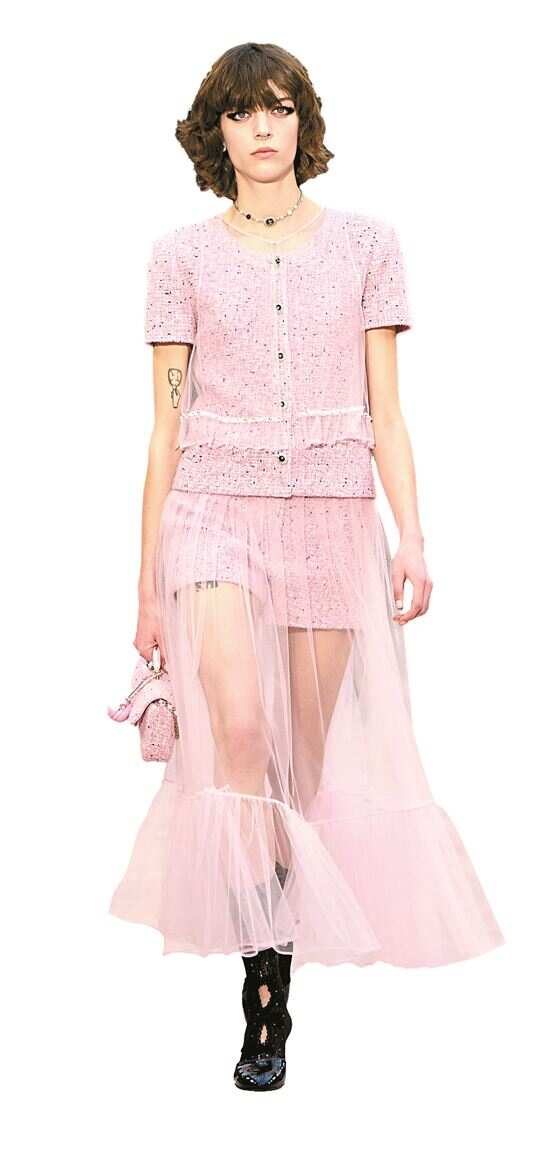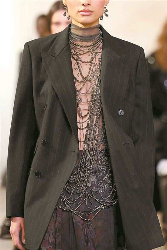 ▲透视感较强的薄纱内搭可配大量感配饰,平衡整体造型感。