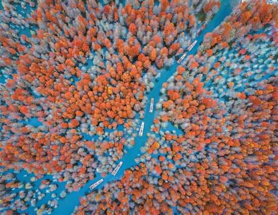 ■每年深秋,青龙湾扎根于水中渐变红色的落羽杉成为蓝天碧水下耀眼的存在。