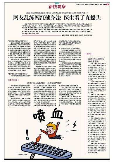 近日,上海一位网友听说“指压板超慢跑”一个月可以瘦10公斤,便跟着“打卡”。没想到,这位网友在家跟练“踩指压板”20分钟,脚底突然“喷血”,这一经历经媒体报道后登上热搜。