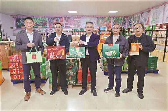 ■邱锦全(左二)与工作组一起推广忻城特色产品。新快报记者 王飞/摄
