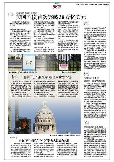 综合新华社电 美国财政部22日数据显示,美国国债总额首次突破38万亿美元。