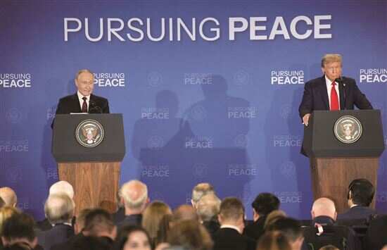 ■8月15日,美国总统特朗普(右)与俄罗斯总统普京在美国阿拉斯加州安克雷奇市埃尔门多夫-理查森联合军事基地举行会晤后,共同出席联合记者会。 新华社发