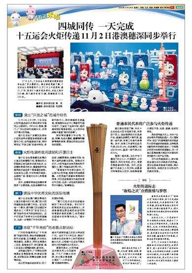27日上午,十五运会火炬传递专题新闻发布会在广东大厦举行。据记者在现场了解,十五运会火炬传递将于11月2日上午在香港、澳门、广州、深圳4个城市同步举行,共设火炬手200棒,每个城市各有50棒,每棒跑动50至100米。