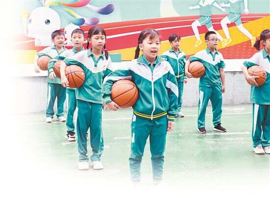 ■广州市天河区体育西路小学校运会开幕式上,学生们表演篮球秀。(资料图)