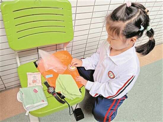校内体育活动时间增多,有家长担心孩子运动出汗后衣服湿了怎么办?在盈彩美居小学,记者留意到,在大课间、体育课结束后,不少同学拿着一个小背包到更衣室换衣服。匡昱说:“我们在广州教育学会的指导下,开发了学生运动包,还设立了男女学生分开的更衣场所。”一名三年级学生在大课间结束后向记者展示了她的运动包。只见她打开一只橙色的抽绳轻便小背包,从中拿出了小汗巾、湿纸巾、干湿衣物分离袋、计时手表、备用衣服等物品。“这些都是我自己收拾的,用这个小包带着很轻很方便。”该学生说。