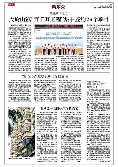 新快报讯 记者杨英杰 通讯员大岭山宣报道 近日,大岭山镇举行“百千万工程”项目合作签约仪式,14家助力企业、4家规划设计院及专家顾问团队齐聚,集中签约23个高质量合作项目,总投资额超1.3亿元,为大岭山镇“百千万工程”三年初见成效注入强劲动力。
