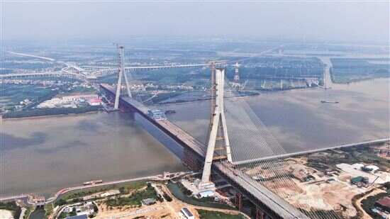 中山东部外环高速公路控制性工程香山大桥顺利合龙,大桥塔高270米,主跨880米,总长1776米。新华社发