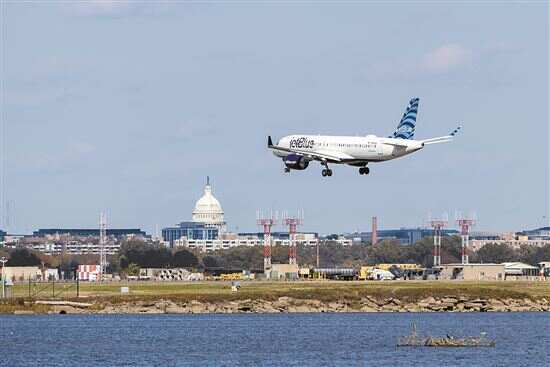 ■11月1日,一架飞机降落在美国弗吉尼亚州阿灵顿的里根国家机场。新华社发