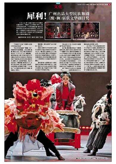 11月4日,第十四届中国艺术节闭幕式在重庆举行。闭幕式上正式揭晓了第十八届文华奖获奖名单,广州原创舞剧《醒·狮》从全国参评的428部作品中脱颖而出,成为广东唯一一部喜获文华剧目奖的剧目,这也是继第十七届文华奖广州斩获三项“文华单项奖”后再次摘得的重磅大奖。
