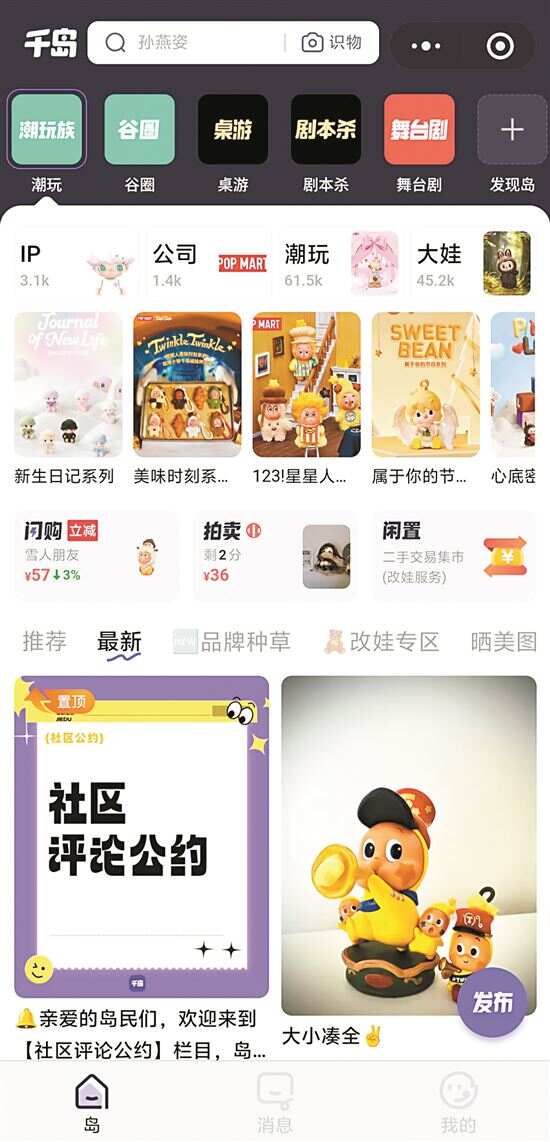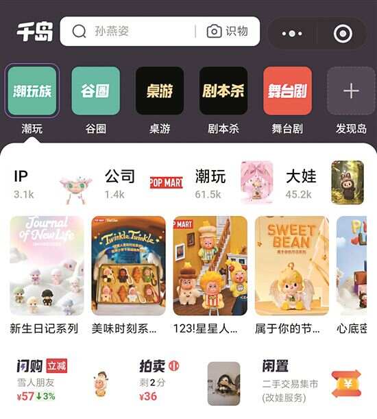 据记者了解,在千岛平台,用户可以在首页选择多个自己感兴趣的领域,即“岛”。如按玩具品类来分,共有21种,其中潮玩岛有258.1万用户,卡牌岛有571.55万用户,谷圈岛有297.86万用户。