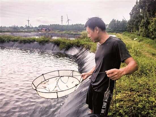 ■雷州市吉凯种养殖专业合作社负责人张美查看新虾苗成长情况。