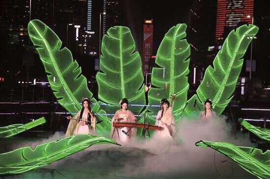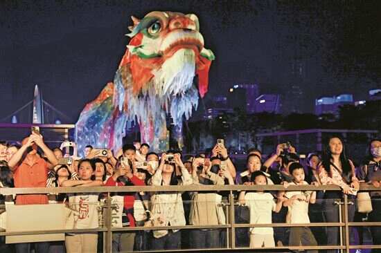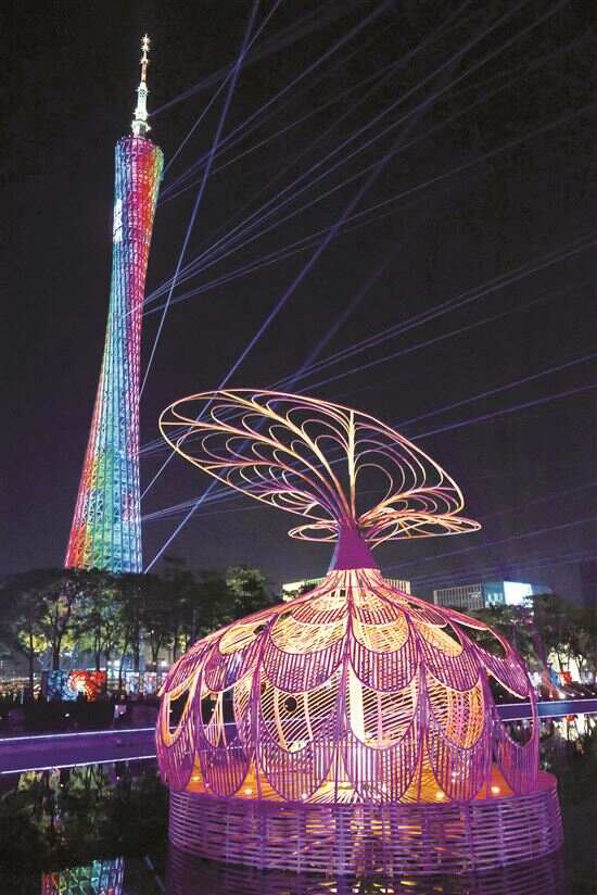 在十五运会开幕式上,身披金光的鳌鱼凌空游弋,如今,这尾鳌鱼已完成从赛场到城市的转场。多组装置均有全新“身份”:开幕式《咏春踏浪》中的悬浮芭蕉叶,化身灯光节作品《蕉雨水色》落户星光大道,经改造后,再现雨后垂露姿态,与江波、双塔夜景相融;巨型木棉花气膜转型为《红棉花映塔》,以广州塔为轴心,灯光下花瓣纹理如丝绸流动,与“小蛮腰”形成光影对话。