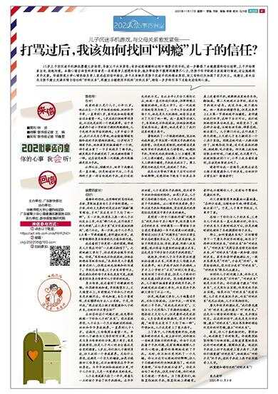 15岁儿子因沉迷手机游戏屡遭父亲体罚,导致父子关系紧张;母亲试图调解的过程中强势没收手机,进一步撕裂了本就脆弱的信任纽带,儿子开始离家出走、拒绝沟通。本期心理咨询室的来信者是一名深陷育儿困境的母亲,她为帮助孩子脱离网瘾费尽心力,但孩子似乎依然与家庭渐行渐远,这让她感到束手无策。华南师范大学心晴热线负责人袁杰在回信中指出,亲子关系缺失是孩子沉迷手机的根本原因,而父母的行为加剧了双方对立。他建议,家长应先与孩子建立充满共情与信任的“好的关系”,再建立合理使用手机的“对的关系”,相信一步步的引导下总能走进他的心扉。
