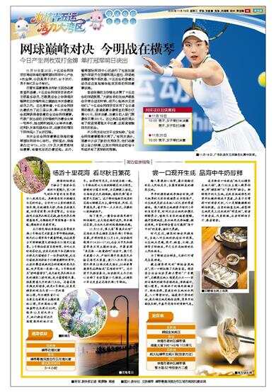 11月19日至20日,十五运会网球项目将在珠海的横琴国际网球中心产生4枚金牌,分别是男子双打、女子双打、男子单打及女子单打。