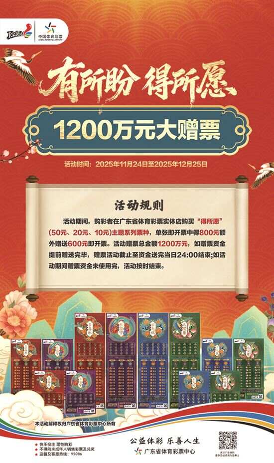 新快报讯 记者陆妍思 通讯员粤体彩报道 岁末将至,福运临门。体育彩票顶呱刮“得所愿”主题即开票近日正式登陆广东市场。为进一步回馈广大购彩者,广东省体育彩票中心已于2025年11月24日至12月25日开展“有所盼 得所愿1200万元大赠票”活动。