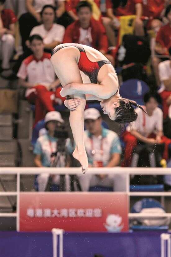 在女子双人10米跳台的决赛中,带伤作战的全红婵与搭档王伟莹夺得第五名。在女子双人3米跳板比赛中,林珊与队友陈艺文组合夺得金牌。女子3米跳板的比赛中,林珊再次发挥出色,以379.10分斩获冠军,她以这场“三金收官”之战,为广东跳水摘得了第六金。