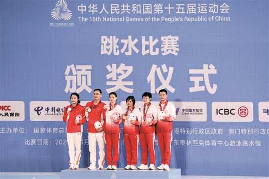 ■十五运会跳水比赛女子3米板决赛,广东队选手林珊(左三)和陈艺文(右二)在领奖台上。