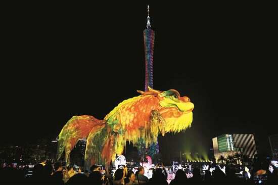 全运元素被巧妙融入灯光节:开幕式节目《咏春踏浪》中的悬浮芭蕉叶化作灯光装置《蕉雨水色》;“鳌鱼”从开幕式“游”入灯光节;巨型木棉花气膜变身《红棉花映塔》装置;“喜洋洋”“乐融融”巡游互动,充分彰显广州作为湾区核心城市的创意与活力。