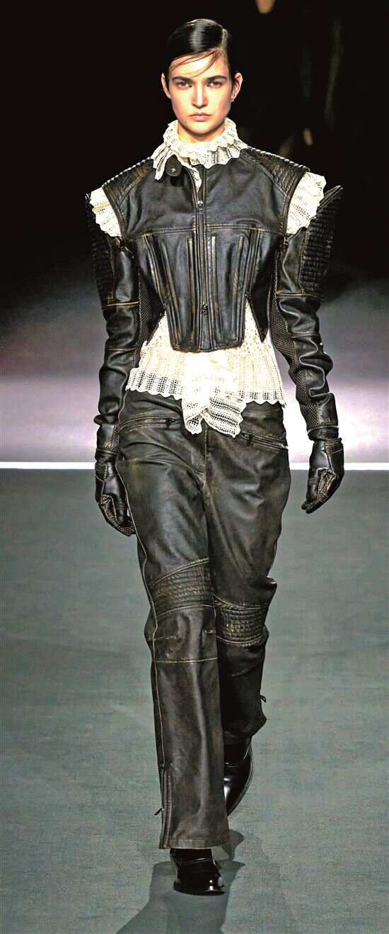 搭配上,皮革与蕾丝、针织、绸缎等材质跨界组合,玩出新意,打破季节造型装扮的沉闷感。