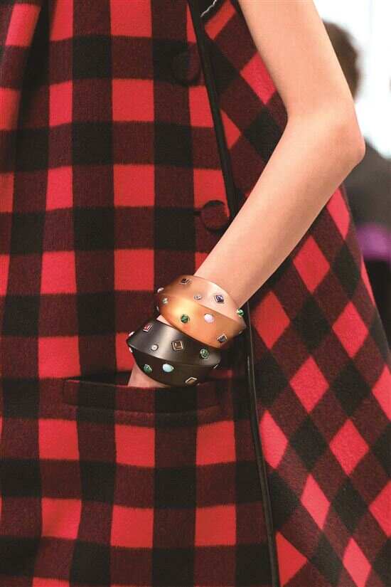 颈部配饰以皮绳项链为核心,绳子是皮革材质,偏手工感,比常规金属链多几分返璞归真。亦有将上世纪70年代风格皮革与金属吊坠结合的、让质感间的碰撞带来有格调的时髦感;还有用小牛皮嵌件打造的层叠颈链,搭高领毛衣时露出2到3厘米的链条让整体穿搭更显精致。