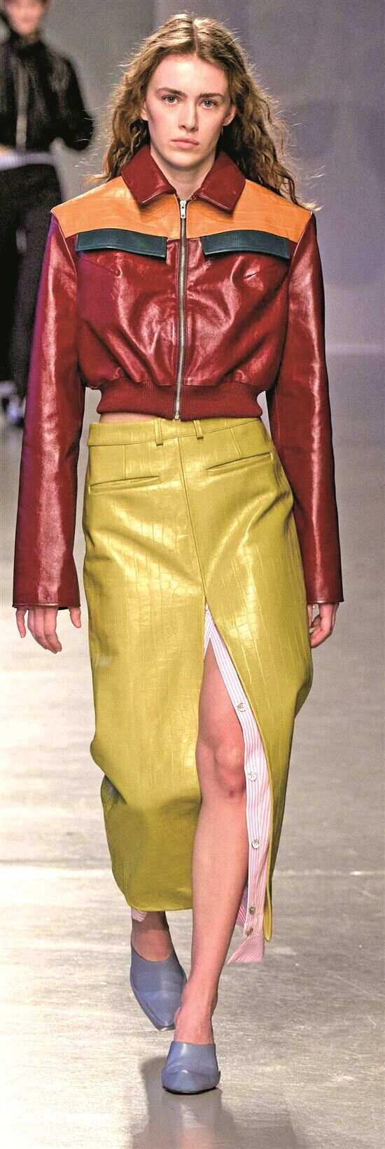 多彩皮裙以高饱和色打破风格界限,尤其是马卡龙色系的皮革半裙,增添清新维度,对喜欢尝新的时髦精而言绝对是适配选择。搭一件基础款上衣如白衬衫或黑色西装外套便足以成为众人瞩目的焦点。动物与抽象几何图案的加入也让皮革单品更具趣味与个性,同时也是展现自信气场、烘托个性的时尚名片。