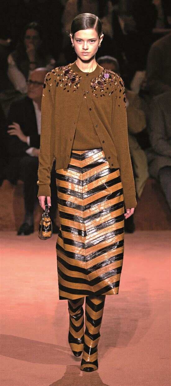 今季流行的皮裙虽仍以修身半裙为主,但因“剪一刀”的开衩细节和丰富色彩、印花的选择而更多变百搭。棕色系如温暖的肉桂色、巧克力色及一直备受欢迎的摩卡慕斯色等自然是秋冬造型穿搭的“大热选手”,无论用来平衡亮色系的耀眼还是提升基础色系的质感都游刃有余。加入开衩细节更能平衡秋冬厚重衣物所带来的沉闷量感,此外今年还有拉链式开衩、纽扣式开衩、系带式开衩等款式,让皮裙更显灵动多变。
