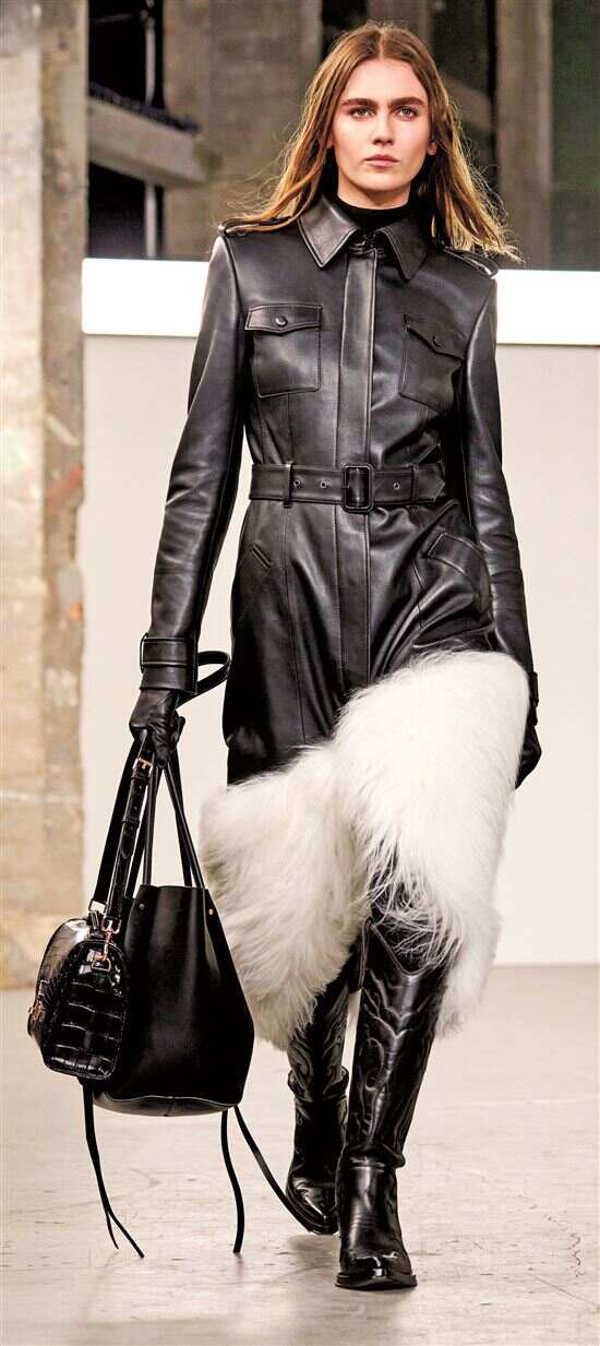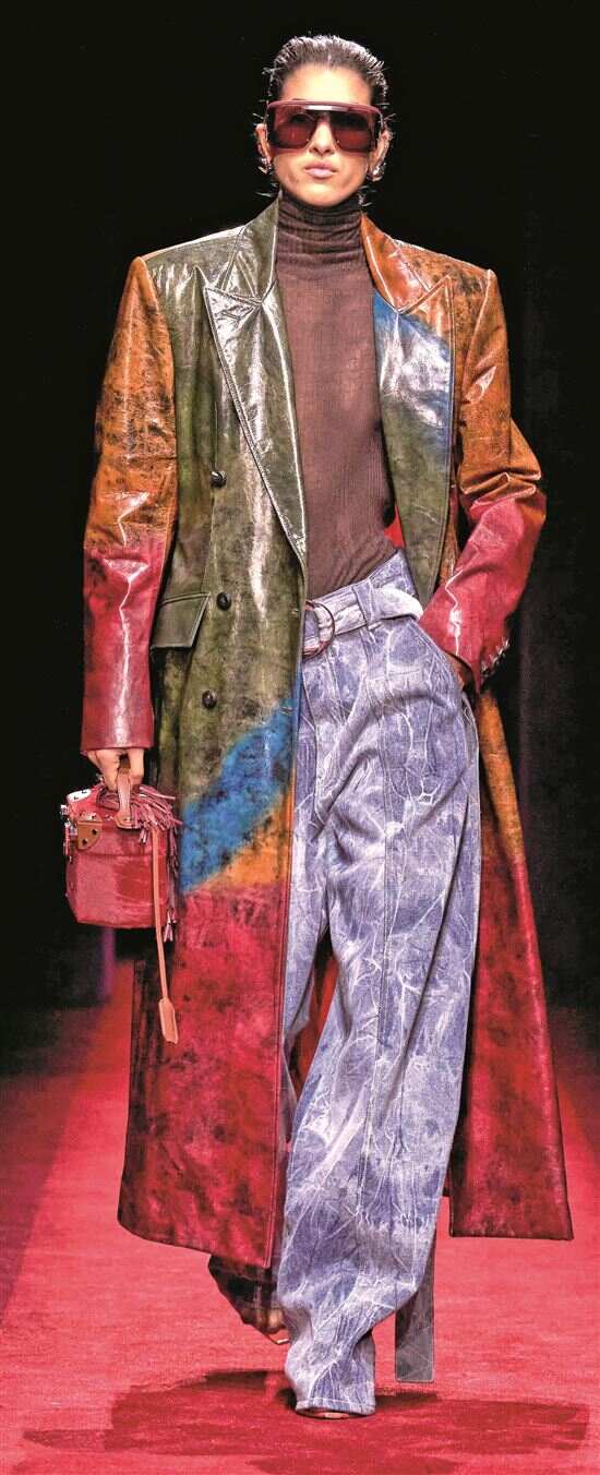 色彩上除棕色系作为本季主流色彩霸屏外,也辅以更丰富多彩的选择,不同色彩皮革单品的层次混搭,进一步提升全身造型的吸睛度。