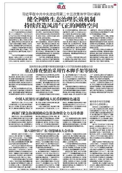 习近平强调,网络生态治理在国家治理中占有重要地位。要在党中央集中统一领导下,健全网络综合治理格局,形成治理合力。各级各部门要强化管网治网的政治责任和领导责任,及时有效解决突出问题,不断提高运用网络了解民意、开展工作的能力。要加强对网络平台、自媒体和多频道网络机构的引导,促使其担负社会责任,自觉成为正能量传播者。