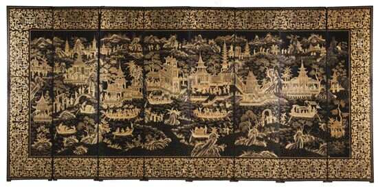 ▲19世纪早期木胎黑漆描金龙舟竞渡图八围屏风。