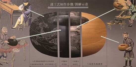 在300多年前的某一天,漆农们正在采集漆树苗,随即选择合适的地方种植漆树,到了每年的6-9月开始割漆,只见他们小心翼翼地用刀,在漆树干上割开月牙形的小口,并插入蚌壳,等待漆液慢慢从伤口中渗出,漆农把这些采集而来的漆液汇集到木桶里,运倒入大容量方形木件中,开始搅拌晒漆,继而用炭火煎漆、熬漆,直至进入制作加工漆器的作坊。