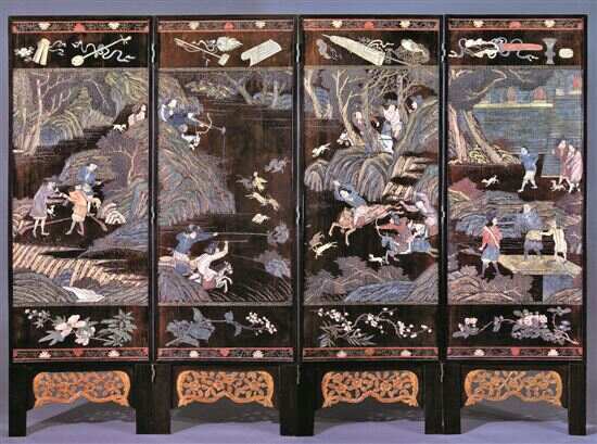 ▶款彩荷兰人狩猎图小屏风,法国东印度公司博物馆藏。
