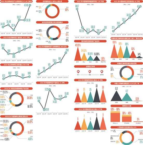 价高也没拦住踊跃的钱包。这么多高价的咖啡豆流向哪里?2025年全球咖啡豆产业规模将达47.46亿美元,产量将达1072万吨,消费量将达999万吨。在主要进口市场中,中国以3.85%的占比排名第五,次于成熟的传统市场欧盟、美国、日本和菲律宾;中国的消费量则以4%排在第四,次于欧盟、美国和巴西。