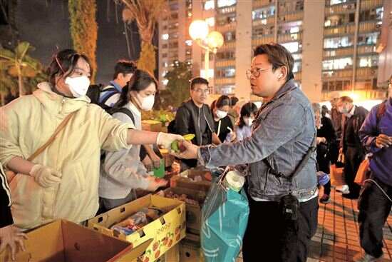 ■义工在宏福苑附近向受火灾影响的市民派发物资。