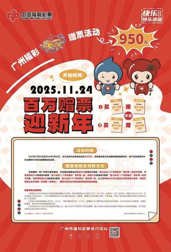 本次活动共安排赠票资金950万元,计划至2026年1月25日结束,如活动赠票金额累计达到950万元,则在赠票金额用完的当期快乐8游戏期结后结束,活动结束之日为本次活动赠票兑领截止日。截止日后不可兑领本次活动的赠票,截止日前未兑领视为自动放弃领取该中奖彩票的赠票,仍可按游戏规则兑领正常的中奖奖金。