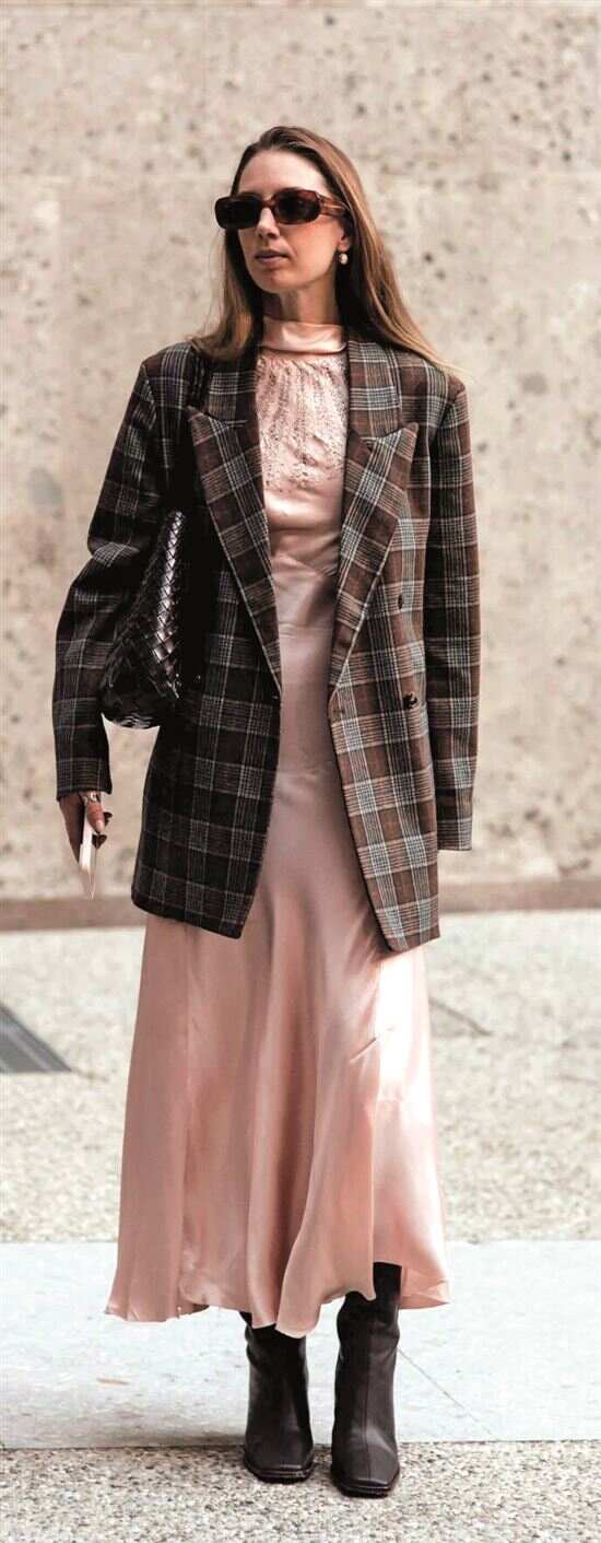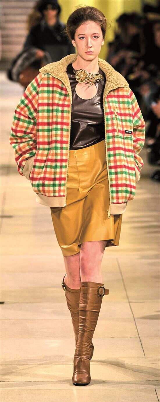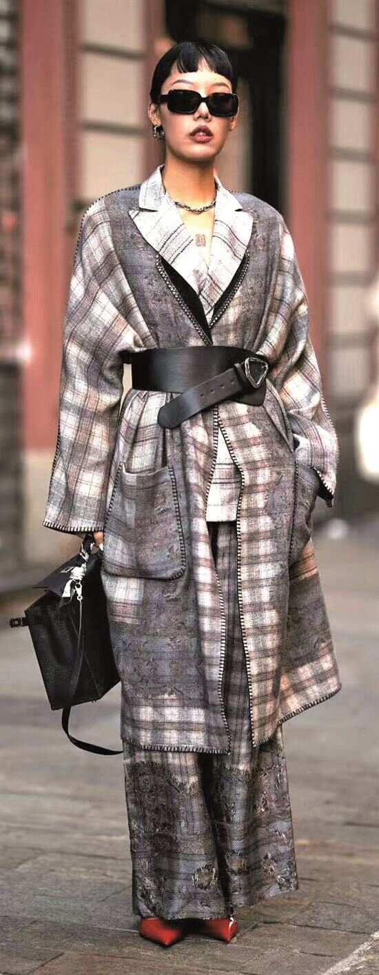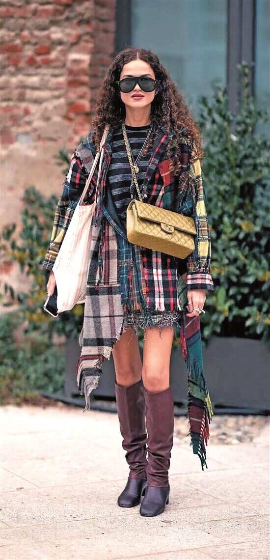 不同材质的格纹叠穿,营造出略带怀旧氛围的造型。