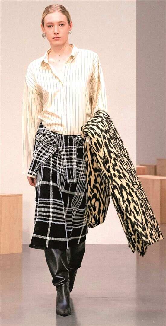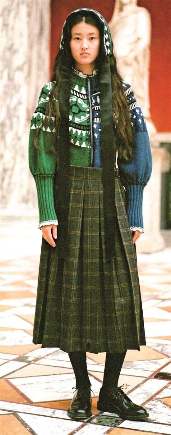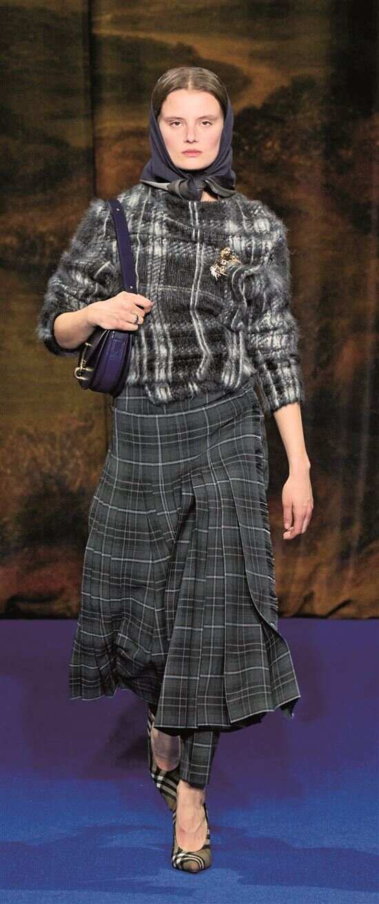 “现代化改造”是格纹适配都市造型穿搭场景的关键,设计师通过简化、重构、撞色这三大手法革新传统格纹。在线条上细化粗壮纹路、减少繁复感,适配职场穿搭;在色彩上降低饱和度,采用低饱和配色凸显都市简约质感;在构图上拼接不同地域格纹,形成设计感混合格纹等。此外面料上也赋予了格纹新的活力,欧根纱、雪纺等透明材质以轻盈通透的视觉效果适配叠穿与空气感造型;磨毛、拉毛等工艺强化了面料绒感与触感,呼应冬季怀旧氛围,让格纹在都市场景中实用性与设计感兼备。
