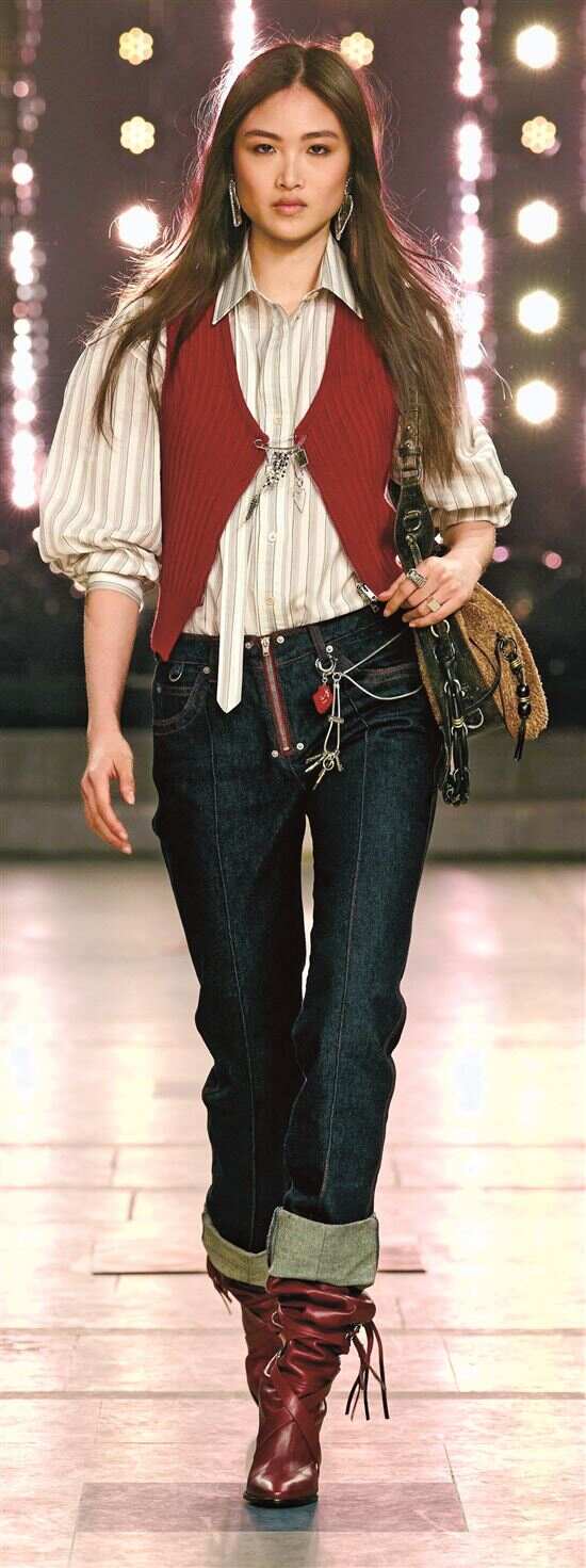 这一造型穿搭风格的核心特质聚焦三重融合:刚柔碰撞间,硬朗牛仔、金属马具扣饰与柔软羊绒、皮革打造出兼具游牧民族的坚韧与都市女性的柔美;功能与美学兼顾,多口袋、可调节腰带、耐磨面料等实用设计,与格纹、刺绣、流苏等装饰元素的配合,实用又好看;传统与现代共生,盘扣、毡帽、绑腿等经典游牧元素经现代改造如宽檐毡帽缩为窄檐款、传统长袍简化为利落风衣,让古老的符号在都市的场景中重焕新生。