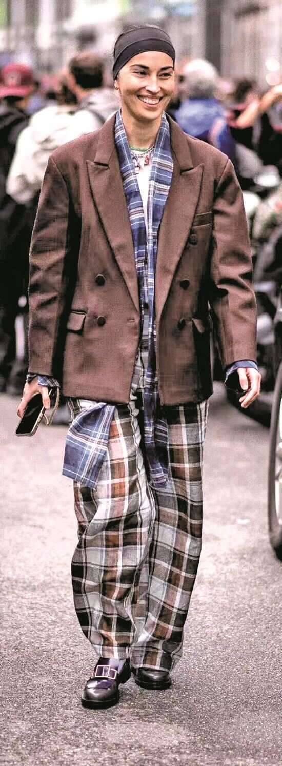 ▲尝试“格纹+格纹”的进阶穿搭,需遵循大小格纹区分、色彩同系两个原则。
