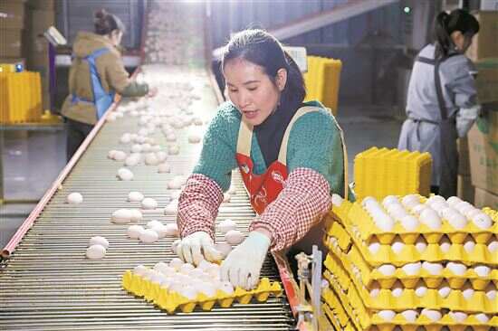 盛园蛋业带动了当地劳动力就业,图为工人快速捡蛋,与传送带拼速度。