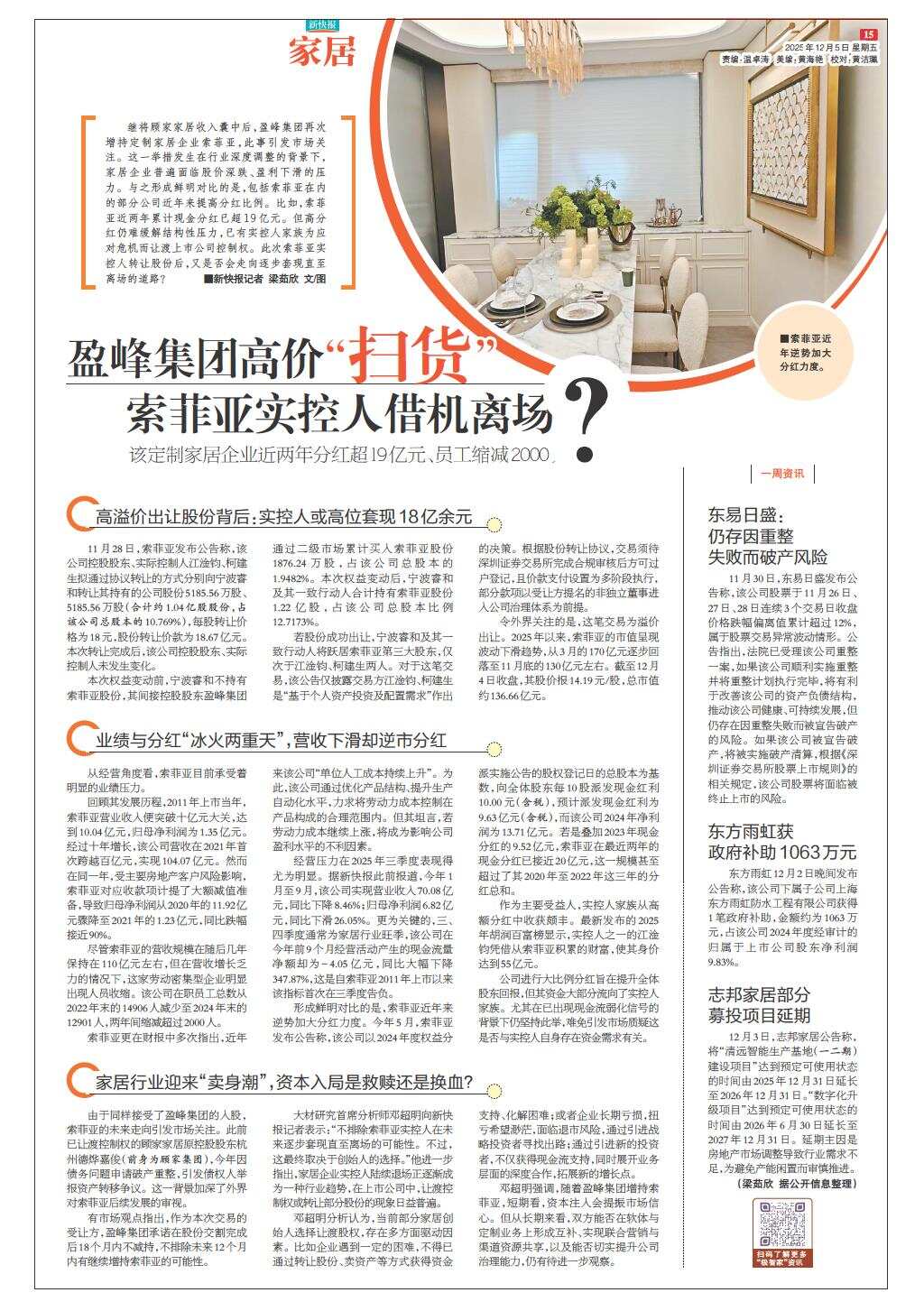 盈峰集团高价“扫货” 索菲亚实控人借机离场?